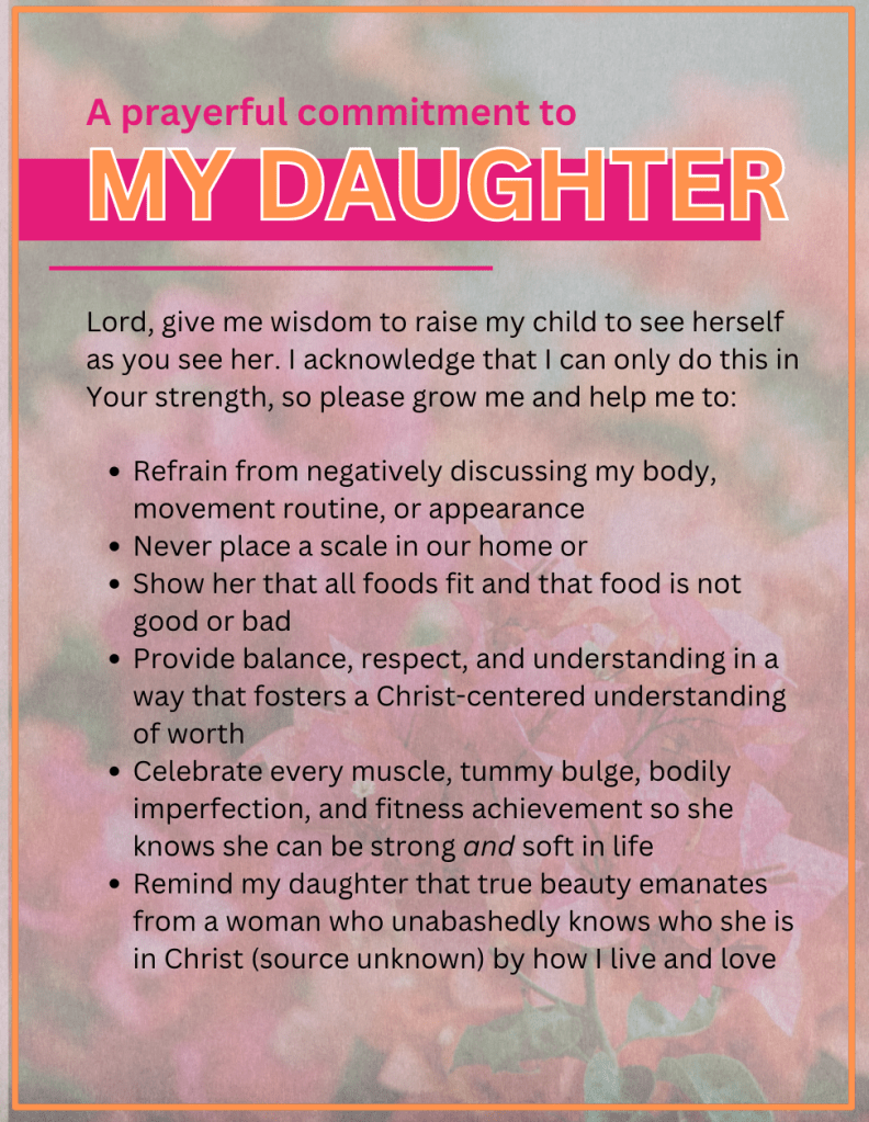 My daughter will not grow up hearing me negatively discuss my stomach, movement routine, or appearance. She will not see a scale in our home or a mommy who designates “good” foods and “bad” foods. By God’s grace, I will provide balance, respect, and understanding that fosters a Christ-centered understanding of who my daughter is. With His help, I will celebrate every muscle, tummy bulge, bodily imperfection, and fitness achievement that I can—reminding my daughter that true beauty emanates from a woman who unabashedly knows who she is in Christ (source unknown).